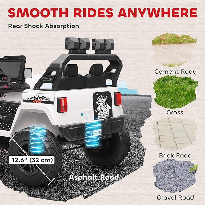 - Safe and Smooth Ride: With slow start technology, rear suspension, and a safety belt, the kids' electric car provides a secure and stable ride that minimizes bumps. It handles various terrains such as cement, asphalt, and lawns for an enjoyable journey