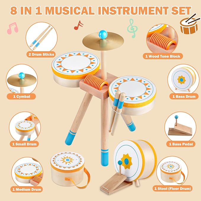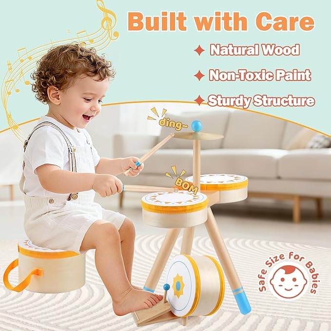 - Montessori Music Learning Toy – This kids wooden drum set offers toddlers endless fun with drumming and rhythm play, encouraging creativity, self-expression, and parent-child interaction through engaging music activities.