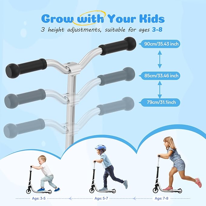 - 3-Level Adjustable Handlebar: Designed to grow with your child! The handlebar of kids scooter adjusts from79–90cm (31–35 inches), ideal for kids around ages 3–8. Just adjust the height to find the perfect fit for your little rider.