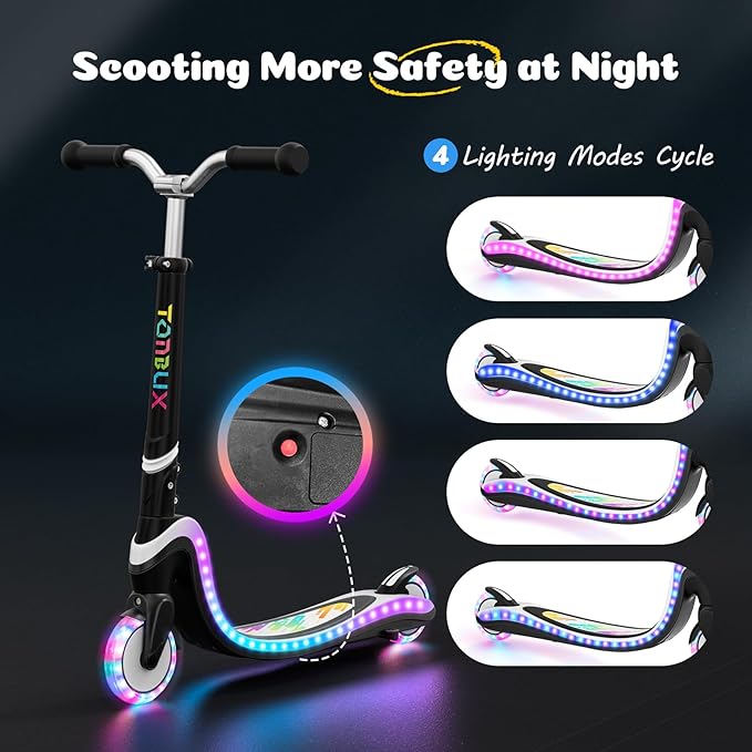 - Light-Up Deck & Wheels – Double the Fun: The scooter features a glowing deck with 4 dazzling light modesand bright LED wheels that flash as kids ride — making every ride a cool light show, especially at night.