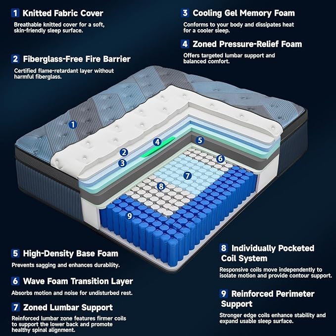 - Zoned Support That Works While You Sleep Engineered with reinforced lumbar foam and a zoned coil system, this mattress targets the lower back and hips—reducing sinkage and improving spinal alignment. Ideal for easing back pain and waking up fully rested.