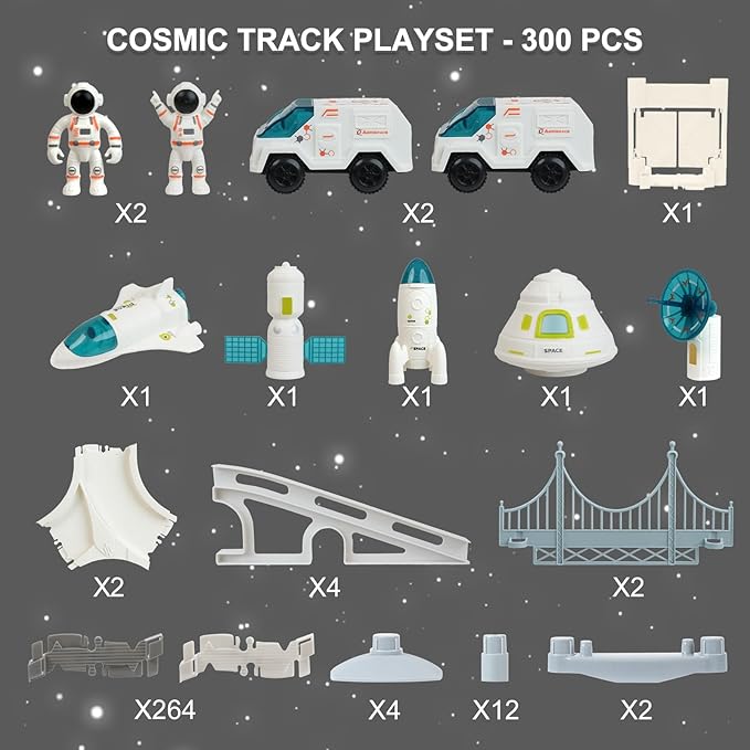 - The Joy of Exploration: This track toy allows kids to experience exciting adventures. It features 300 creative accessories, including 264 flexible track components, as well as various related accessories such as mini figures, rockets, and signal towers, enhancing the realism of the play experience. Whether playing indoors or outdoors, kids can immerse themselves in this magical journey.