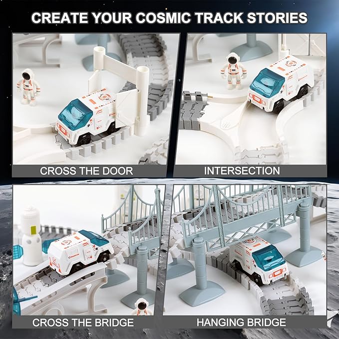 - Creative Track Design: With this creative track set, children can freely combine and create various interstellar track layouts. Flexible track components can be bent and folded freely, allowing for unlimited track designs. Racing cars effortlessly navigate on the track, adding fun and challenges to the gaming experience. This set also stimulates children's interest in exploring the universe and helps them understand the mysteries of the universe.
