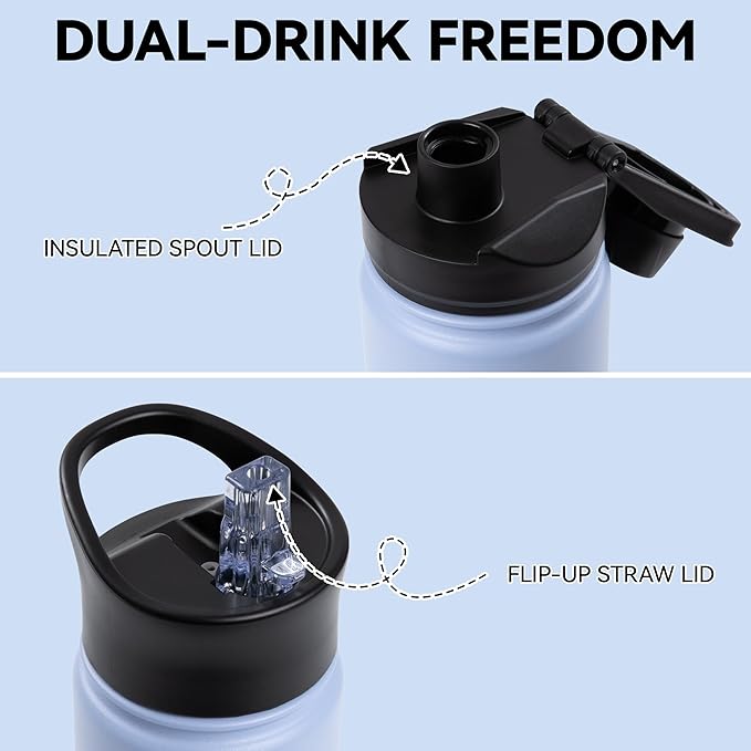 - Durable Body, Pure Sips: Crafted with 18/8 stainless steel and powder-coated exterior, this water bottle shrugs off daily uses. bpa-free lids seal tight— just clean hydration. Built for the daily grind: travel, sports, gym and school