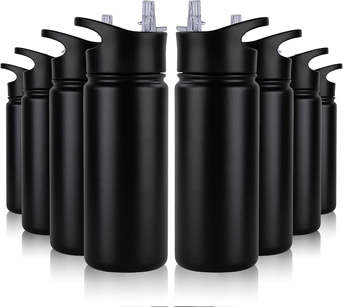 16 oz Insulated Water Bottle Bulk 8 Pack, Straw & Spout Lid, Keep Cold 24H, Spill Proof, BPA-Free, Double Wall, Stainless Steel Kids Water Bottles for School, Sports, Black