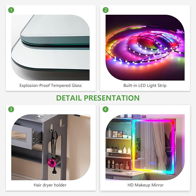 HNEBC Vanity Desk with Sliding Mirror and LED Lights, RGB Vanitys with Charging Station, Makeup Vanitys with Remote Control, White Dresser with Stool/Lager Drawers for Bedroom (Grey)