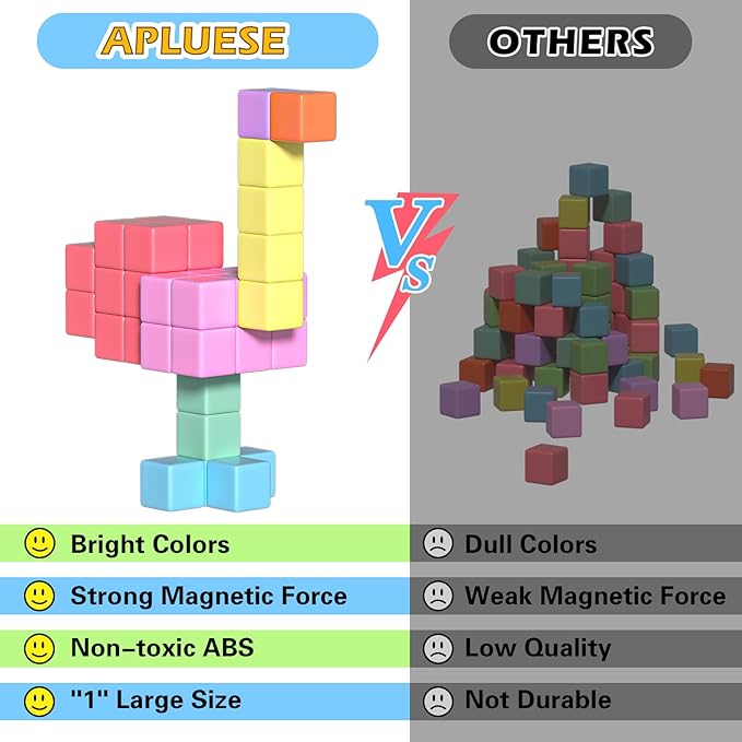 - Safe Material, Friendly Design: Apluses magnetic cubes are crafted from premium, non-toxic ABS plastic. Each piece features smooth surfaces and rounded edges for a safe, comfortable grip. Thoughtfully designed for little hands, they let kids build and play with confidence-while parents enjoy peace of mind knowing playtime is always worry-free.