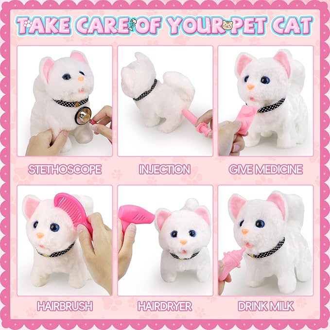 - Kids Doctor Kit: Includes pink doctor dress up set, toy stethoscope with simulated heartbeat sound, walking cat toy ( (batteries not included), doctor tools, 6 grooming accessories, and storage bag. Let toddlers enjoy veterinarian play, vet set fun, and pet grooming in one complete kit