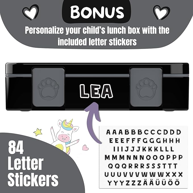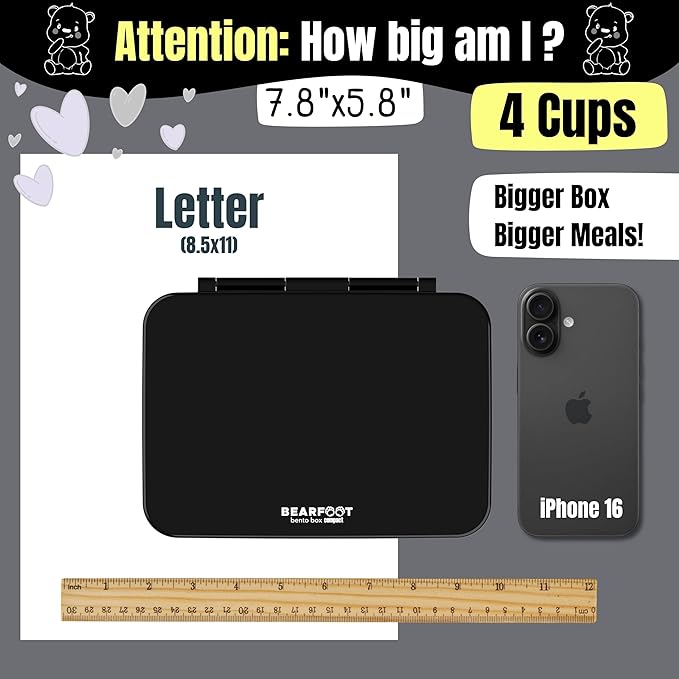 BEARFOOT Kids Lunch Box with Compartments – Compact & Lightweight | Leak-Proof, BPA-Free, Dishwasher & Microwave Safe | Hand-Drawn Design for Preschool, School, Travel (Black, 4 Cups)