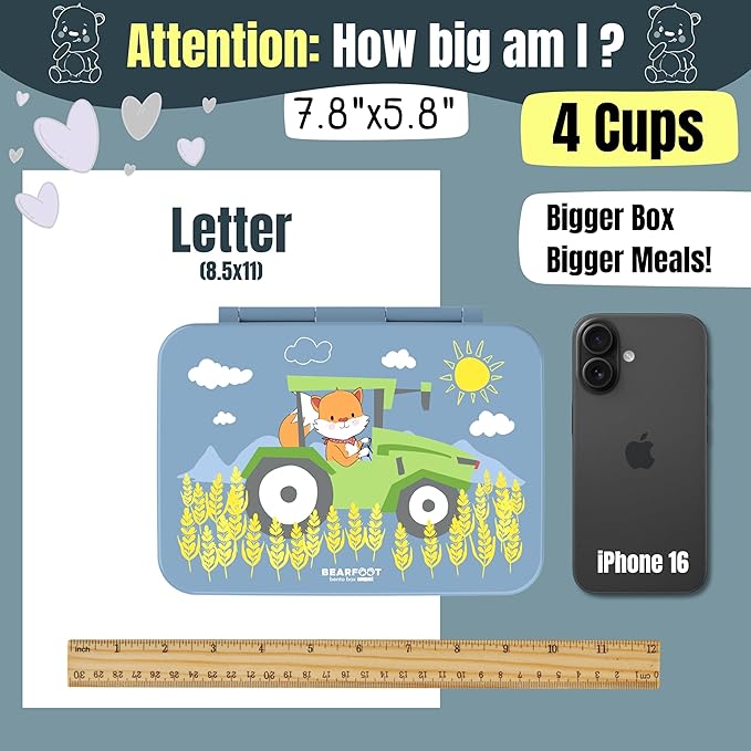 BEARFOOT Kids Lunch Box with Compartments – Compact & Lightweight | Leak-Proof, BPA-Free, Dishwasher & Microwave Safe | Hand-Drawn Design for Preschool, School, Travel (Tractor Fox Blue, 4 Cups)