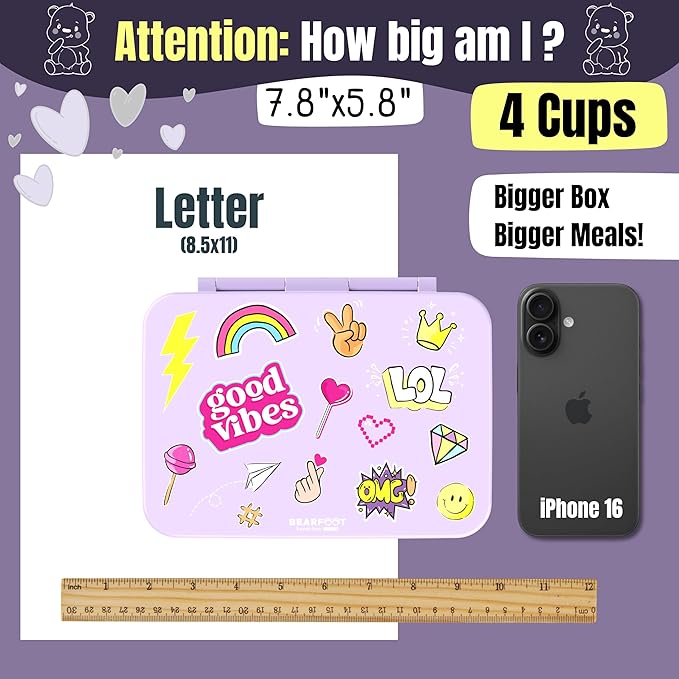 BEARFOOT Kids Lunch Box with Compartments – Compact & Lightweight | Leak-Proof, BPA-Free, Dishwasher & Microwave Safe | Hand-Drawn Design for Preschool, School, Travel (Sticker Purple, 4 Cups)