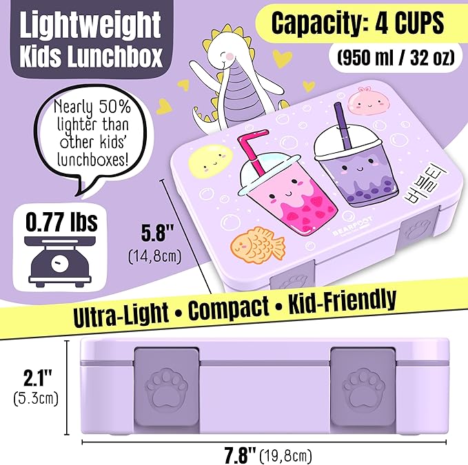 BEARFOOT Kids Lunch Box with Compartments – Compact & Lightweight | Leak-Proof, BPA-Free, Dishwasher & Microwave Safe | Hand-Drawn Design for Preschool, School, Travel (BubbleTea Purple, 4 Cups)