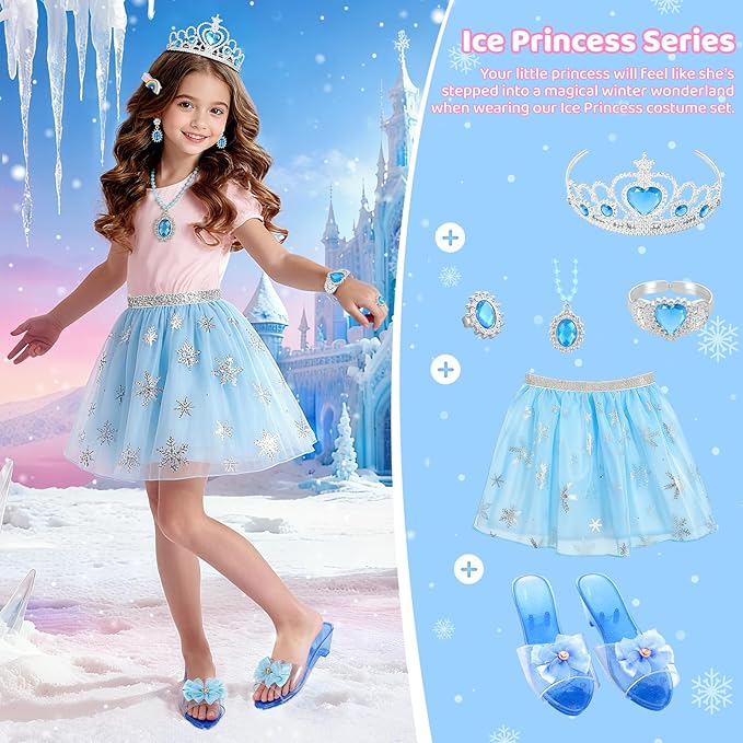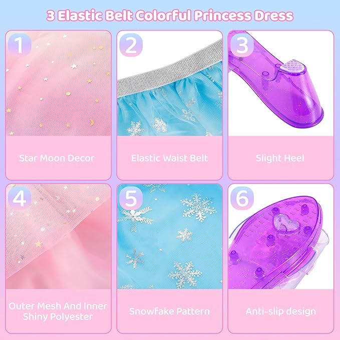 - Elegant Adorable Princess Costumes Set:This versatile princess dress-up shoe set has a polyester lining and an outer layer of tulle which is covered by snowflakes, stars, moon patterned glitters, complete with an elastic waistband for a comfortable, adjustable fit.These colorful, theme-driven skirts and accessories not only spark creativity through role-play but also nurture confidence and fashion aesthetics, allowing your budding style icon to effortlessly switch between fairy-tale