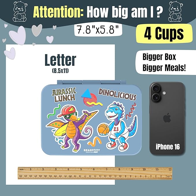 BEARFOOT Kids Lunch Box with Compartments – Compact & Lightweight | Leak-Proof, BPA-Free, Dishwasher & Microwave Safe | Hand-Drawn Design for Preschool, School, Travel (Dinos Blue, 4 Cups)