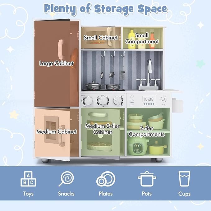 - 【Plenty of Storage Space】: Equipped with a large cabinet, a medium cabinet, a small cabinet, a small compartment, a medium 2-tier cabinet, a 2-tier compartments, 3 hanging hooks, and a towel rack, the kids kitchen playset offers abundant storage space for snacks, books, and cookware. Therefore, kids can learn the skill of item organization from an early age.