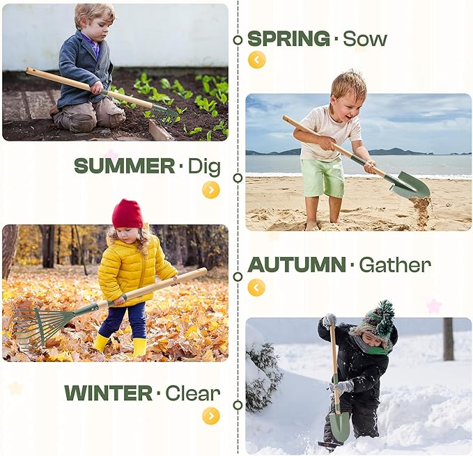 - 5. Durable, Kid-Friendly Materials---Made of strong, smooth metal with no sharp edges, this kids wheelbarrow set is built to last through every season. Easy to clean and weather-resistant, it’s a great outdoor toy for garden play, backyard fun, or even sandbox adventures.