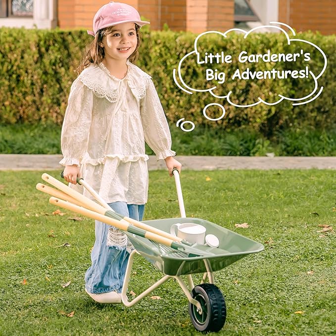 - 1. Real Garden Fun for Little Explorers---This kids gardening set includes a sturdy wheelbarrow, 3 garden tools, a watering can, and 4 plant labels. Perfect for outdoor play, children can dig, plant, water, and label their “garden,” learning through imaginative hands-on activity.