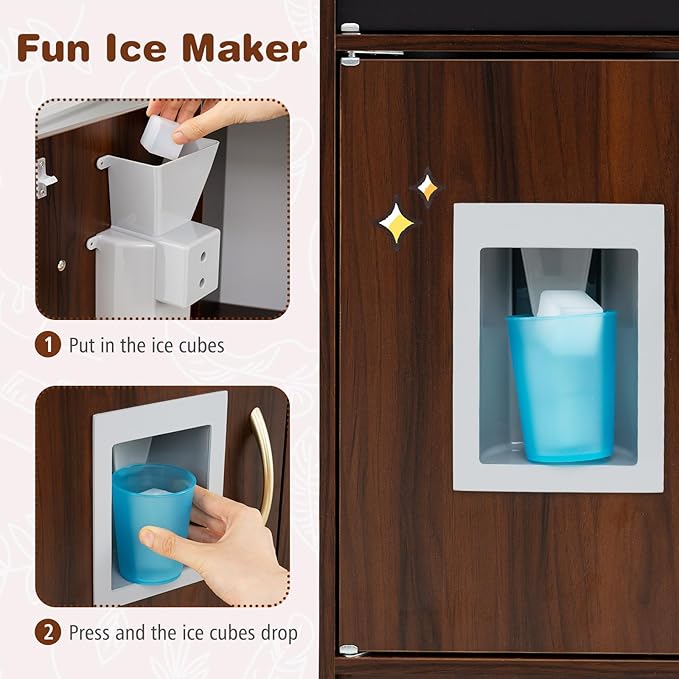 - Additional Simulated Areas: There are multiple simulated areas for added fun. With the microwave and oven, yummy food is easily accessible. Besides, kids can pretend to call friends on the telephone and press to get ice cubes with the ice maker. And the rotatable knobs with “click” sounds are intriguing.