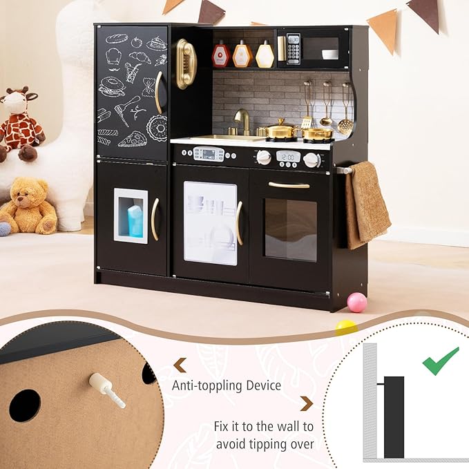 Costzon Kids Kitchen Playset, Wooden Pretend Cooking Toy Set w/Real Sound, Large Blackboard, Telephone, Microwave, Ice Maker, Dishwasher, Oven, Storage Space, Play Kitchen for Kids Ages 3+ (Black)