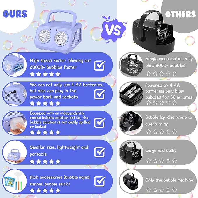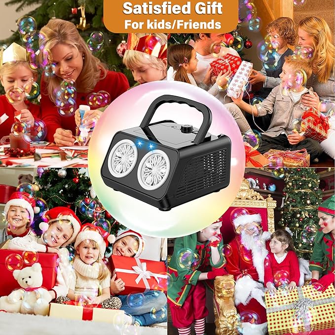 - 🌈Diverse Usage Scenarios:Whether it's family entertainment, birthday parties, outdoor picnics, kindergarten activities, commercial activities, etc., this bubble machine can be perfectly adapted, adding joy and a dreamy atmosphere to different scenarios, allowing you to enjoy the fun of bubbles anytime and anywhere.