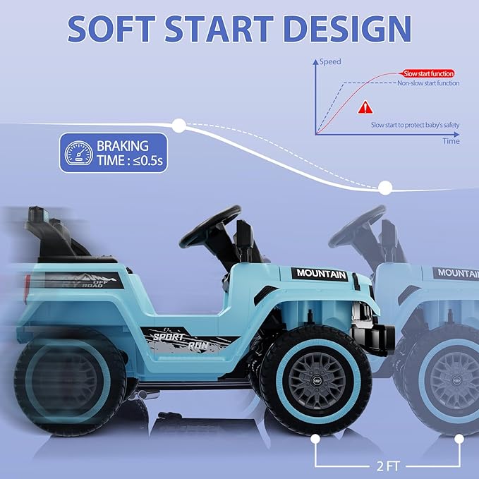 - 【Soft Start & Security Assurance】Anti slip and wear-resistant wheels with shock absorbers ensure smooth and steady driving on the wood floor, brick road or cement road, which gives kids more outdoor driving options. It is worth mentioning that soft start technology of the kid's ride-on car prevents children from being frightened by sudden acceleration or braking.