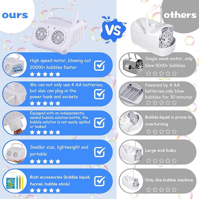 - 🌈Diverse Usage Scenarios:Whether it's family entertainment, birthday parties, outdoor picnics, kindergarten activities, commercial activities, etc., this bubble machine can be perfectly adapted, adding joy and a dreamy atmosphere to different scenarios, allowing you to enjoy the fun of bubbles anytime and anywhere.