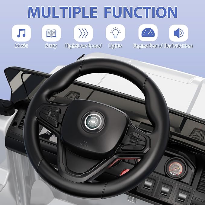 - 【RECHARGEABLE BATTERY】The 12V battery powered car is equipped with efficient and stable batteries. Two 35W motors provide sufficient power and long service life. The lower right corner of the steering wheel is equipped with a safe charging hole, which can be plugged into and charged directly for safety upgrade. NOTE: Be sure to read the instructions carefully before use.