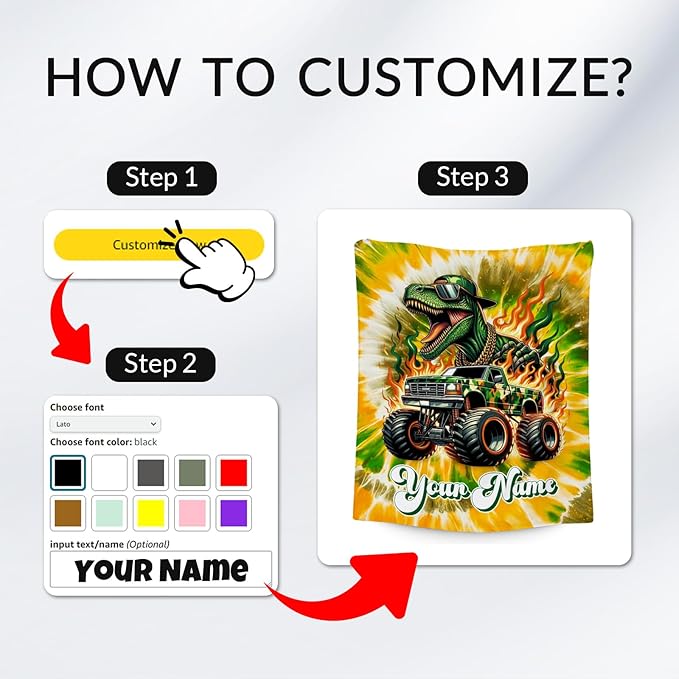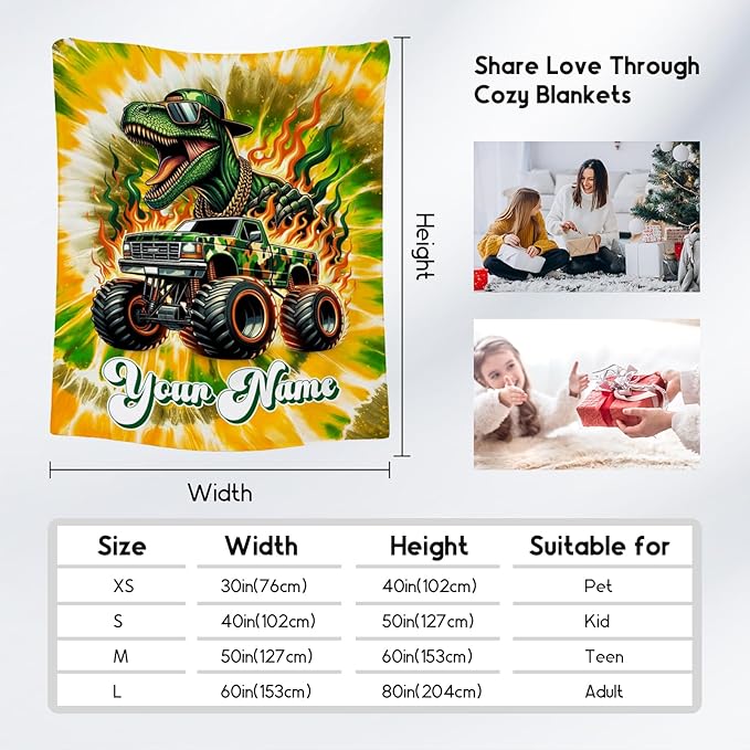 Boys Blanket, Personalized Dinosaur Blankets Gifts for Kids, Custom Tie Dye Throw for Dinosaur Lovers, Soft Fleece Truck Throw for Sofa (4 Sizes)