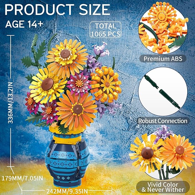 - PREMIUM MATERIAL & DETAIL INSTRUCTIONS: Qinline sunflower building blocks for adult teen comes with 1065 precision-cut ABS blocks that fit tightly and smoothly. Made of high-quality, non-toxic materials, the pieces are safe, durable - ensuring a solid, satisfying build every time. Come with a detailed instructions, helping you assemble into complete model step by step no matter at home or anywhere. This flower gifts for teenage girls all reminisce in holiday spirit, artistic and guaranteed fun