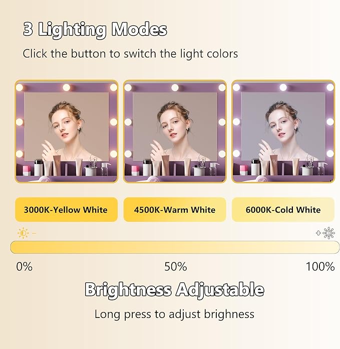 - Vanity Desk with Adjustable Lighting – BORNOON small makeup vanity desk features a large mirror surrounded by seven LED bulbs, offering three lighting modes: warm white, natural white, and cool white. With adjustable brightness, you can create the perfect lighting for makeup, live streaming, or salon use