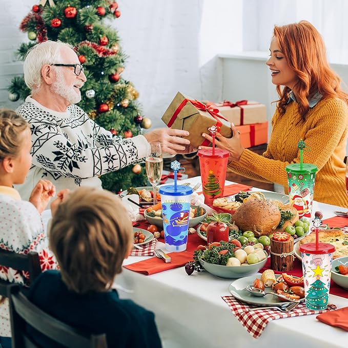 - 🎅 4 Festive Designs + Straw Caps – Includes Christmas tree, Santa Claus, red sleigh, and blue sleigh designs. Each cup comes with a matching lid, straw, and a cute straw cap to make drinks more playful and keep them covered.