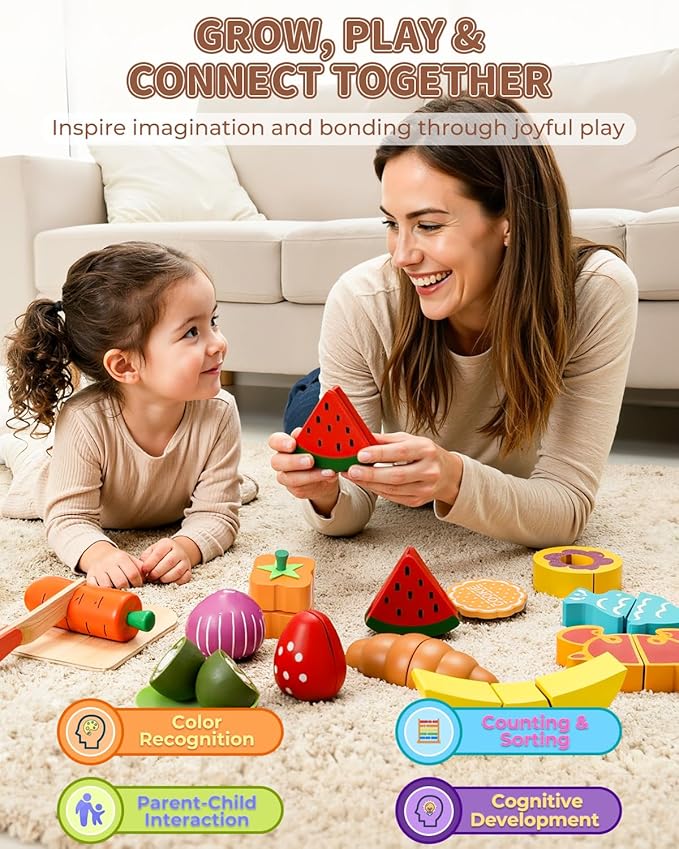 - 【Family Playtime Together: Building Teamwork & Creativity】Cooking together is always more fun! This wooden play food set invites parents and kids to slice, serve, and share their creations — just like a real family meal. Through collaborative role play, children learn communication, cooperation, and social skills while strengthening the parent-child bond. It’s an activity that brings joy to the table and turns simple moments into lasting memories