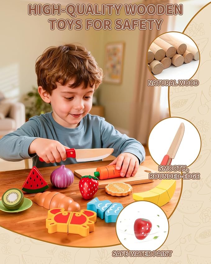 - 【Gift-Ready Design: Learning, Bonding, and Celebration in One Set】 More than just a toy — this wooden play food set is a thoughtful gift that fosters growth, creativity, and connection. Perfect for birthdays, holidays, or classroom surprises, it turns every moment into a joyful learning experience. With its premium gift box packaging and lasting play value, this set is the kind of present that families love to give — and children love to open time and again