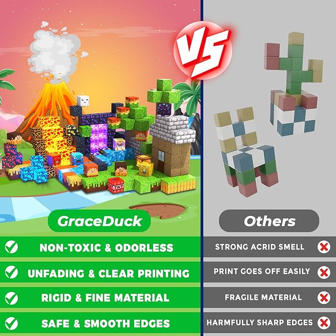 - 【Safe and Durable】GraceDuck magnetic activity cubes are made of high-quality ABS material and crafted with round edges and the right size. Unlike other Magnetic toys on the market, our magnetic cubes kit with super strong internal Magnetic, which is easier for toddlers ages 3+ to stick the cubes together and make builds sturdy. Perfect STEM toys help kids gain a deeper understanding of the structure and learn about magnetic properties!
