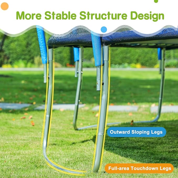 - 【Double Quantity & Curved Net Poles】The outwardly curved net poles are far away from the enclosure net. No afraid of any collision cause there is no risk of hitting to the hard net poles. Each leg is connected to a net pole, and the number ofour net poles is twice that of a traditional trampoline! Let the little jumpers jump as much as they want without worrying about safety!