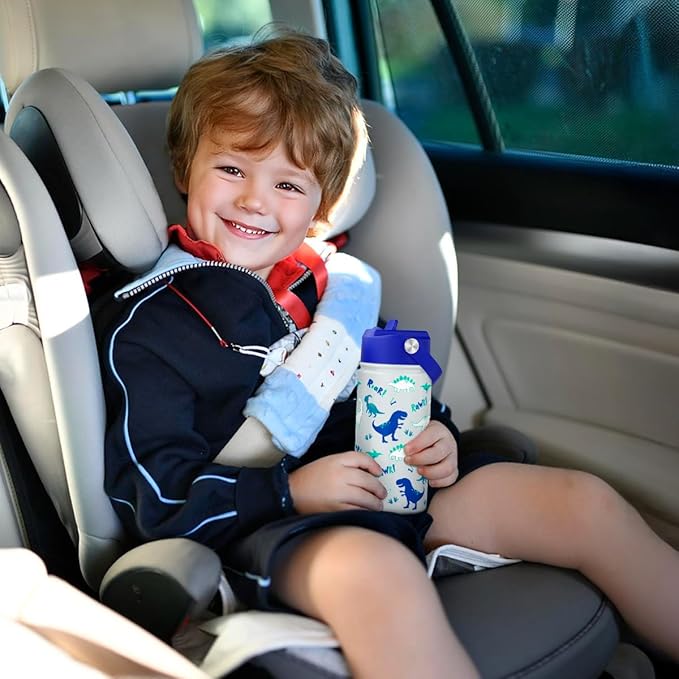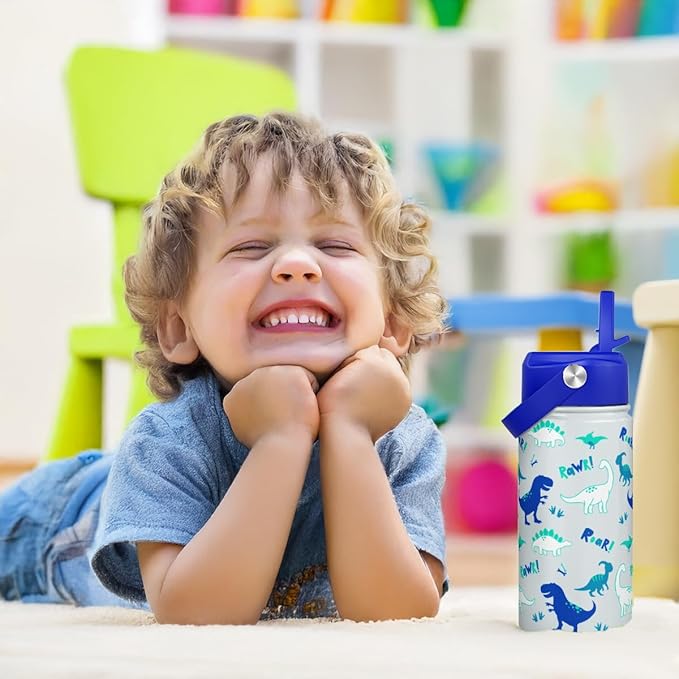SANDJEST Dinosaur Kids Water Bottle with Straw Lid, Pack of 2 Insulated 12 Oz Stainless Steel Water Bottles for Boys, Travel Cup for School Sports