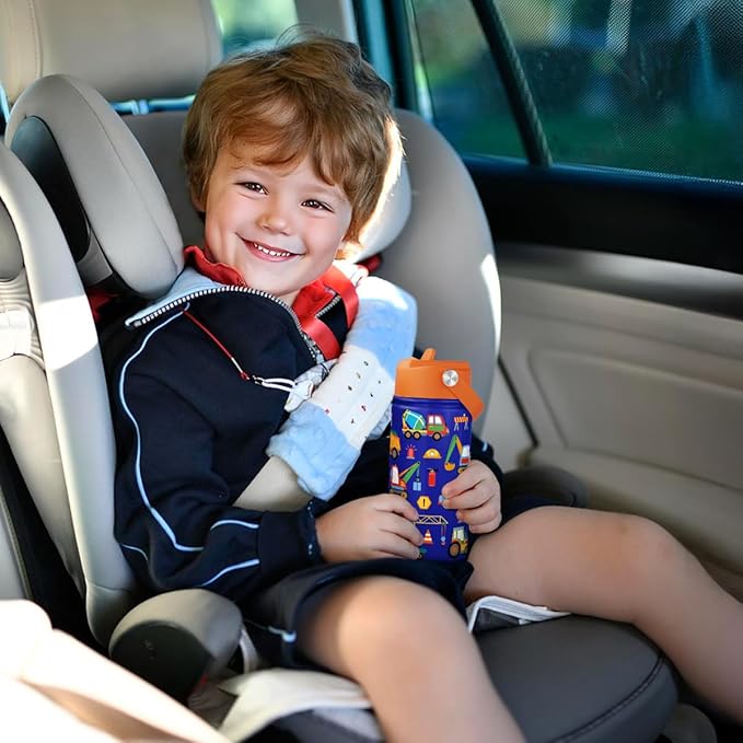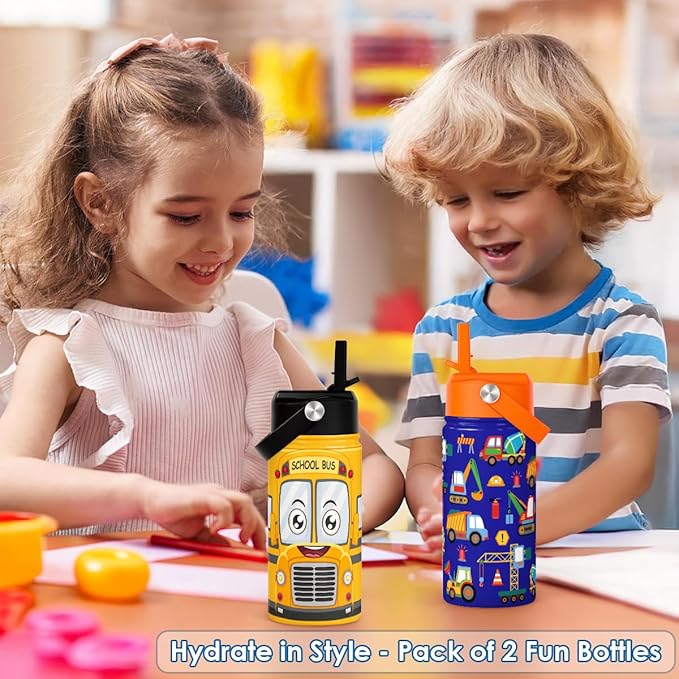 SANDJEST Kids Water Bottle with Straw Lid, Pack of 2 Insulated 12 Oz Stainless Steel Water Bottles for Boys, Travel Cup for School Sports, School Bus - Construction