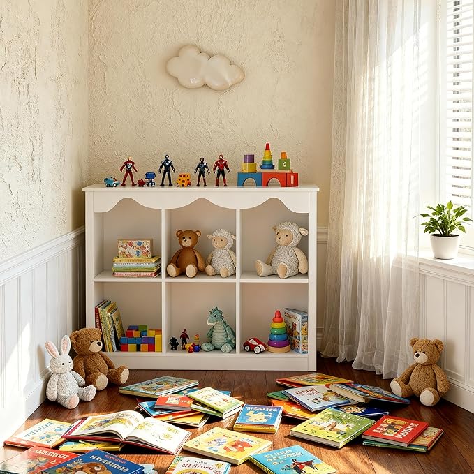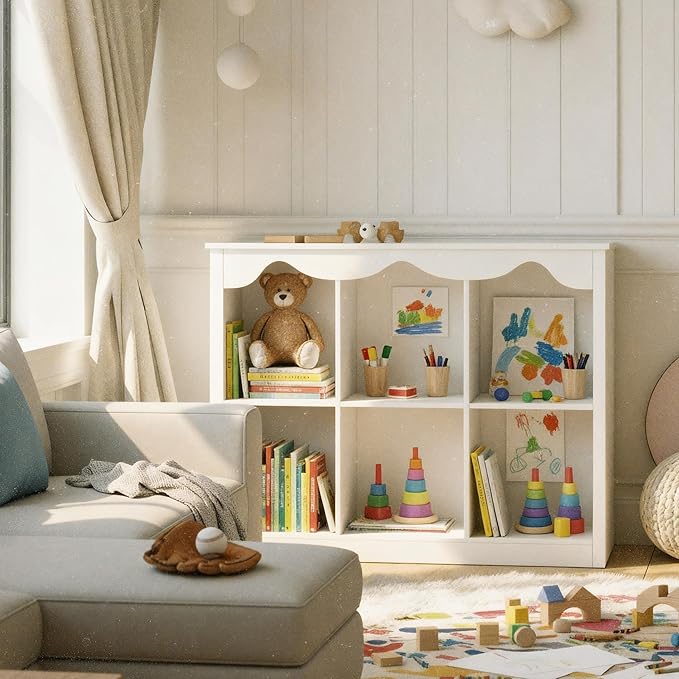 Kids Bookshelf Toy Storage Organizer Wooden Book Shelf Montessori Bookcase 6 Cube Dutch Design,Milkywhite