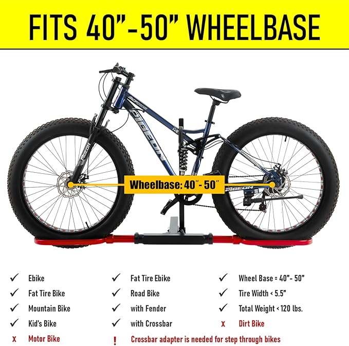 - Fits 40-50" Wheelbase Bikes with Crossbars: Versatile carrier compatible with 0-5.5" tire widths, perfect for electric bikes, cruisers, MTBs, and fat tire bikes
