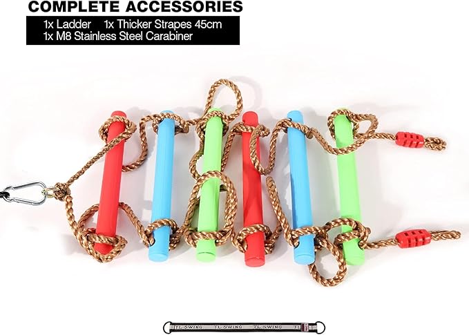 - Premium Rope Ladder & Swing Set: Exquisitely crafted, both the rope ladder and swing measure approx 79”/6.6ft. Suitable for adults and kids to enjoy physical activities. Features solid rungs/discs linked by durable nylon rope, supporting up to 330lbs.