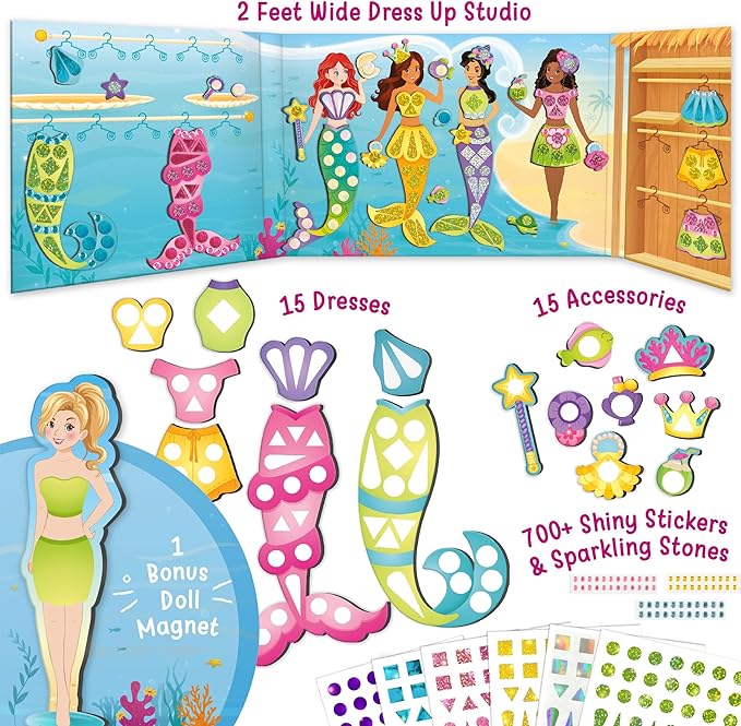 - KIT INCLUDES BONUS MAGNET DOLL : This kit includes 1 Dress Up Studio, 15 Dresses, 15 Accessories, 700+ Shiny Stickers & Sparkling Stones and 1 Bonus Magnetic Doll. Dress up your mermaid magnetic dress up dolls & decorate in your doll house to expand your creative world.