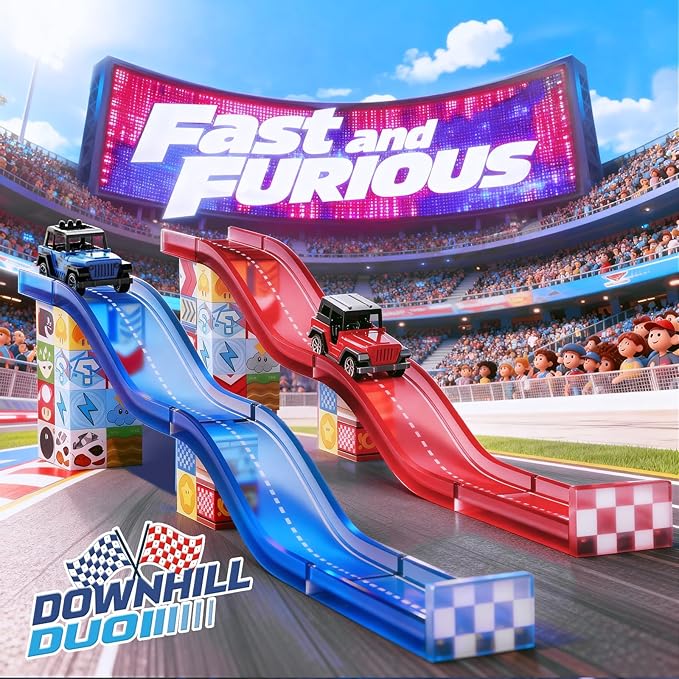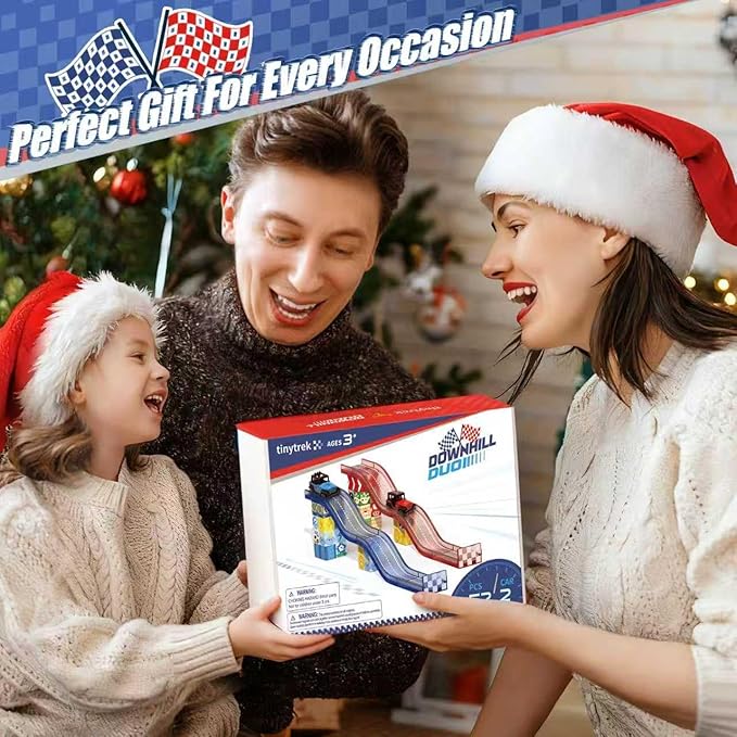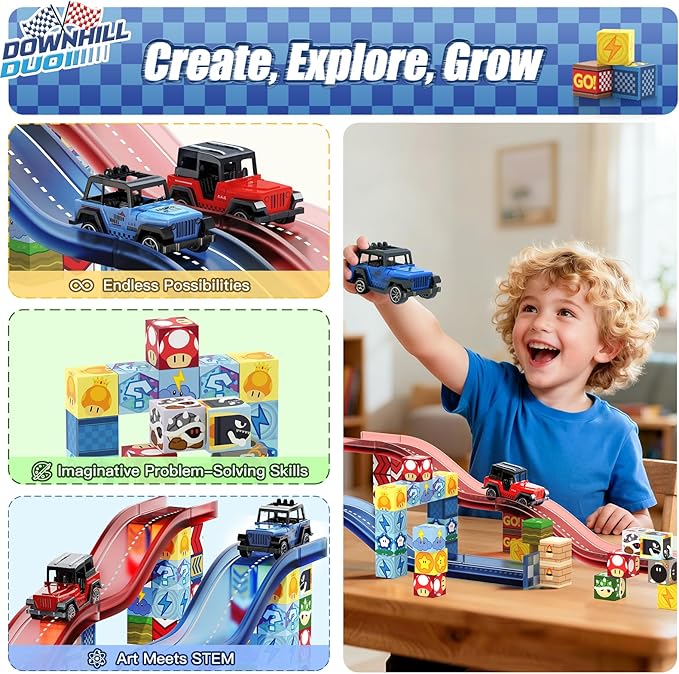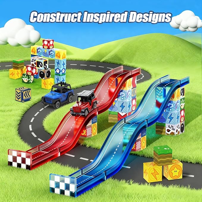 - 52 PCS Magnetic Car Track Set: Includes 40 magnetic squares, 4 road tracks, 4 ramps, 2 racing vehicles, 2 finish line flags, and 4 special action tiles for dynamic play. This magnetic track car toy uniquely blends magnetic construction with action-packed play—young builders can design races, craft moving scenes, and discover foundational concepts through ramps and vehicles, transforming quiet building into exciting, hands-on storytelling
