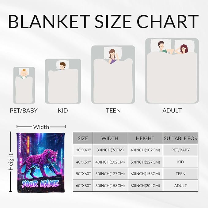 - Custom Your Blanket: Personalize your cheetah blanket by adding a name or initials. The sublimation technique ensures that colors and prints remain vibrant and resistant to fading, so your custom blanket will stay as beautiful and distinctive as you are