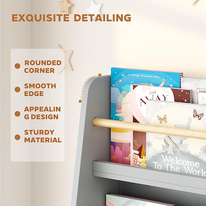 - 【Spacious Kids Bookshelf for Growing Readers】Designed at an ideal height for little ones, this toddler bookshelf makes it easy for children to choose and put away books themselves. The accessible display encourages routine building and independent reading habits.