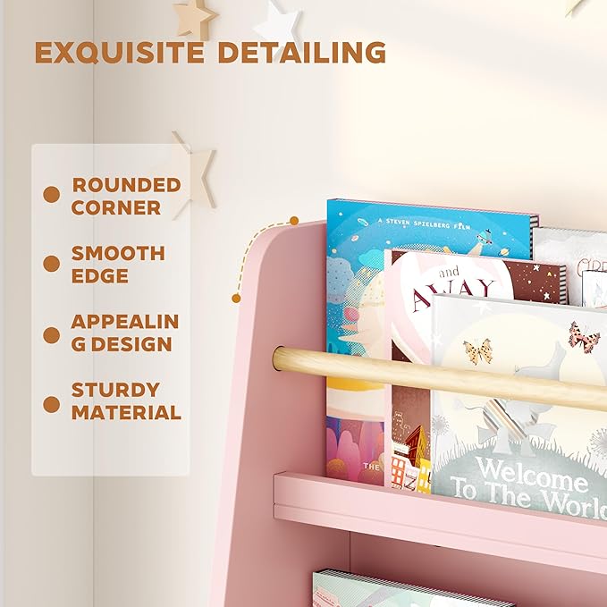 - 【Perfect Book Shelf for Kids Rooms】Available in 5 charming colors (White, Pink, Natural, Gray, and Green), this versatile bookshelf for kids fits wonderfully in bedrooms, playrooms, classrooms, or living areas—adding both function and style to their space.