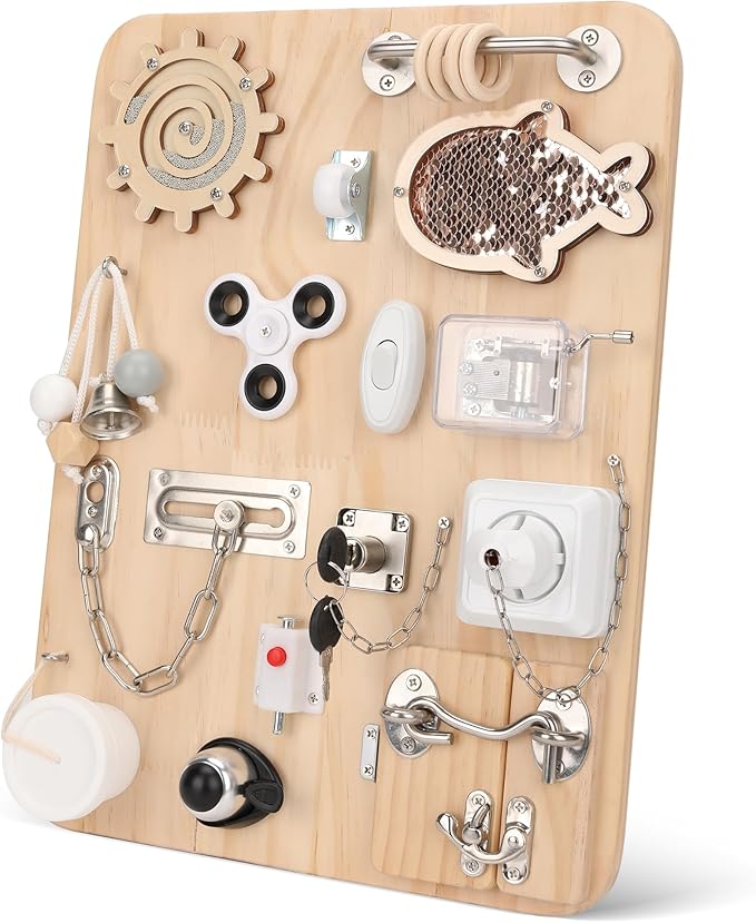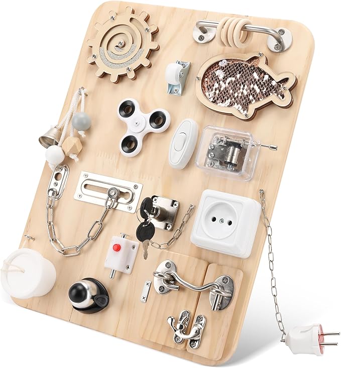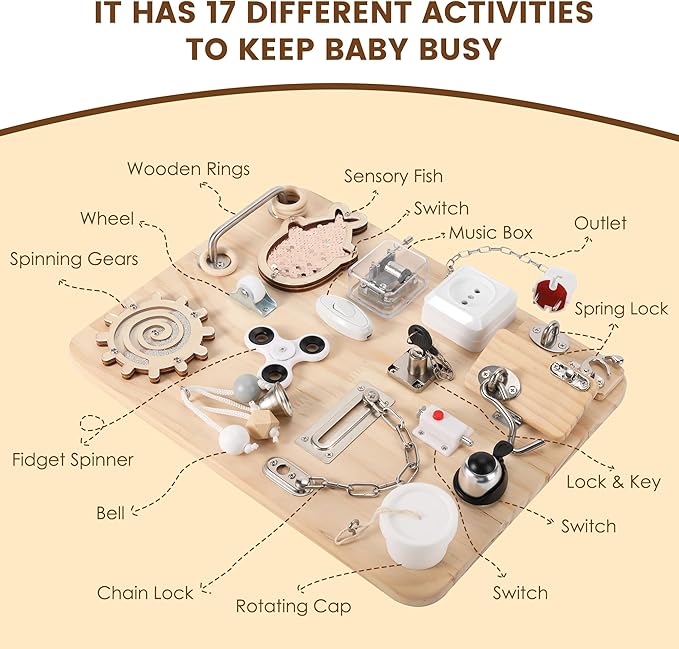 - GREAT GREAT SENSORY TOY: The Wooden Montessori Busy Board includes 17 different activities that keep your child busy and engaged, teaching kids the basic workings of everyday life in a simple, non-tech way.