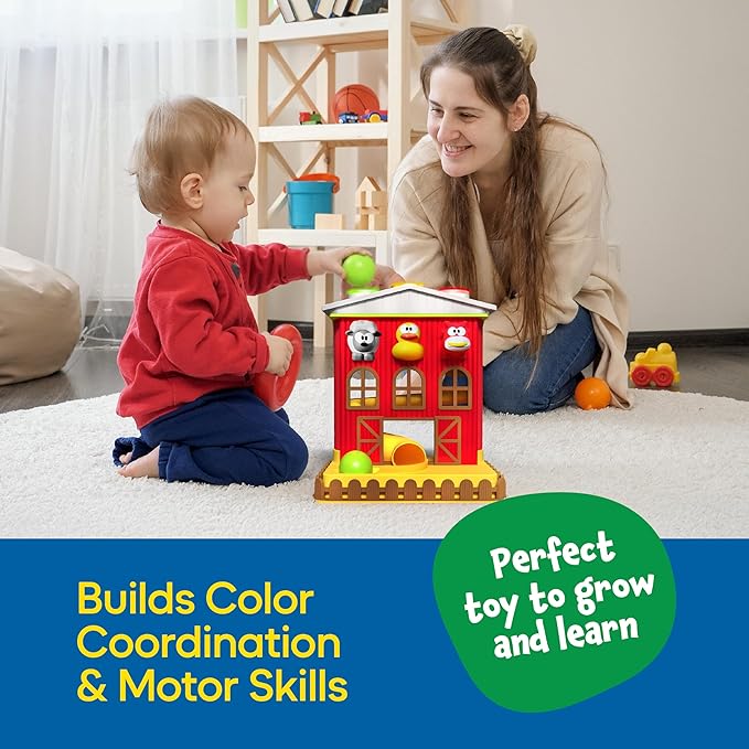 - MONTESSORI EARLY DEVELOPMENT PLAY: Designed for ages 6 months to 2 years, this Farm ’n Play Pound A Ball Barn House encourages hand-eye coordination, fine motor skills, color recognition, and sensory exploration. The bright lights and music stimulate visual and auditory senses, helping little ones learn through active, hands-on play.