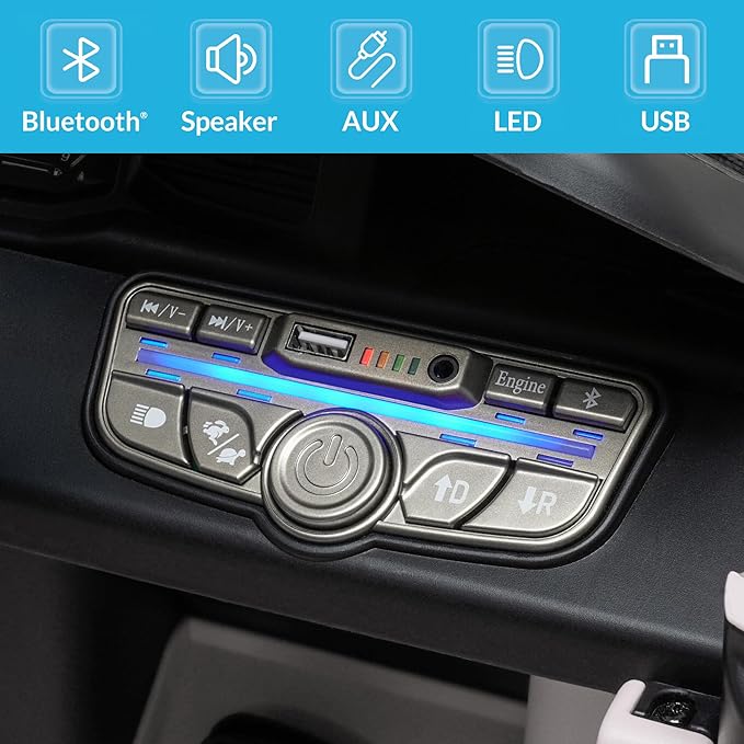 - [Fun Entertainment Features] Kids can cruise with LED headlights, horn and engine sounds, plus AUX, USB, and Bluetooth connectivity-enjoying music and realistic effects for an immersive playtime adventure.
