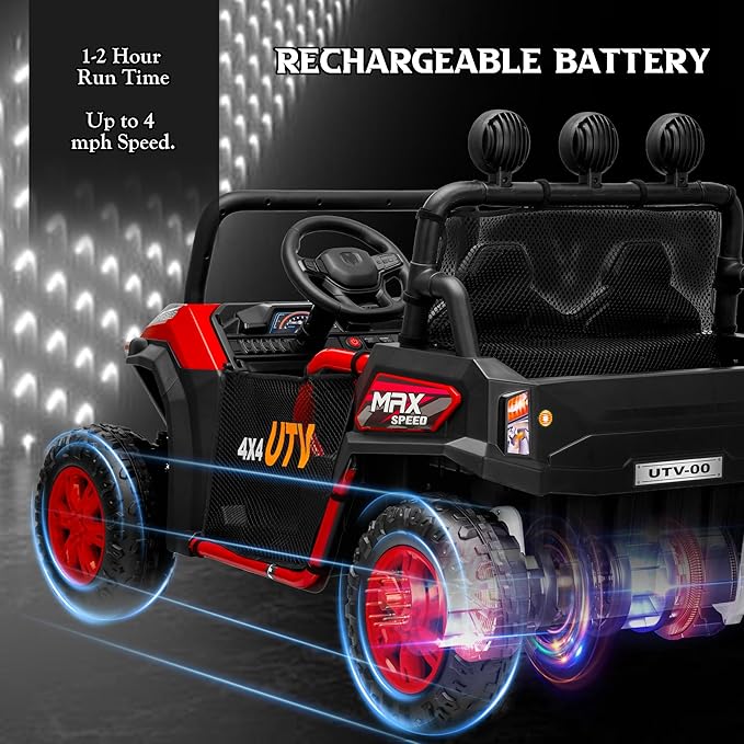 - 【4 X 100W Powerful Engines】Powered by a 24V battery and four 100W drive motors, this ride-on utv car reaches speeds up to 4 mph. Its robust powertrain and excellent climbing capacity support up to 110 lbs, easily handling small slopes, grass, and gravel. This strong, speedy truck is the ultimate gift for adventure-seeking kids.