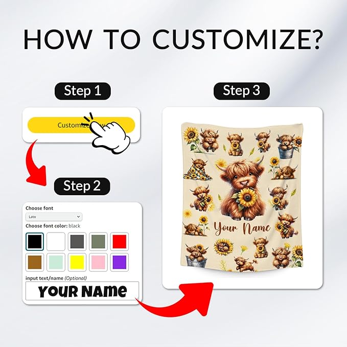 Personalized Kids Blankets with Name, Highland Cow Blanket Gifts for Girls, Custom Cow Gifts with Sunflower, Warm Flannel Throw for Couch, 40"x50"